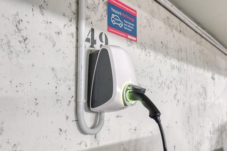 Op deze parkeerplaats zijn oplaadstations aanwezig.